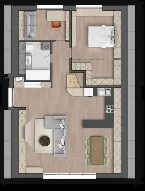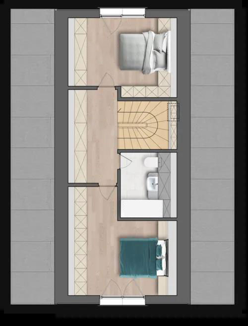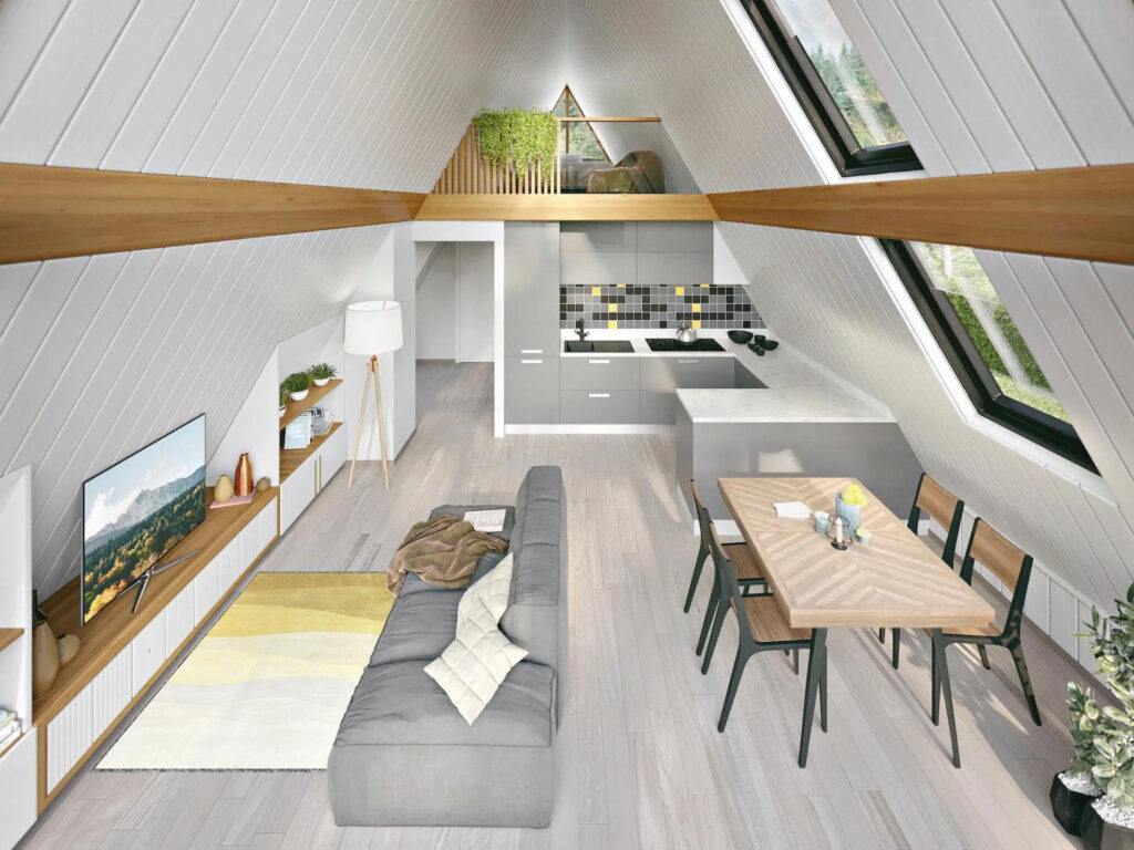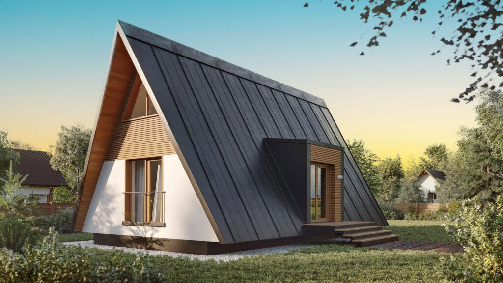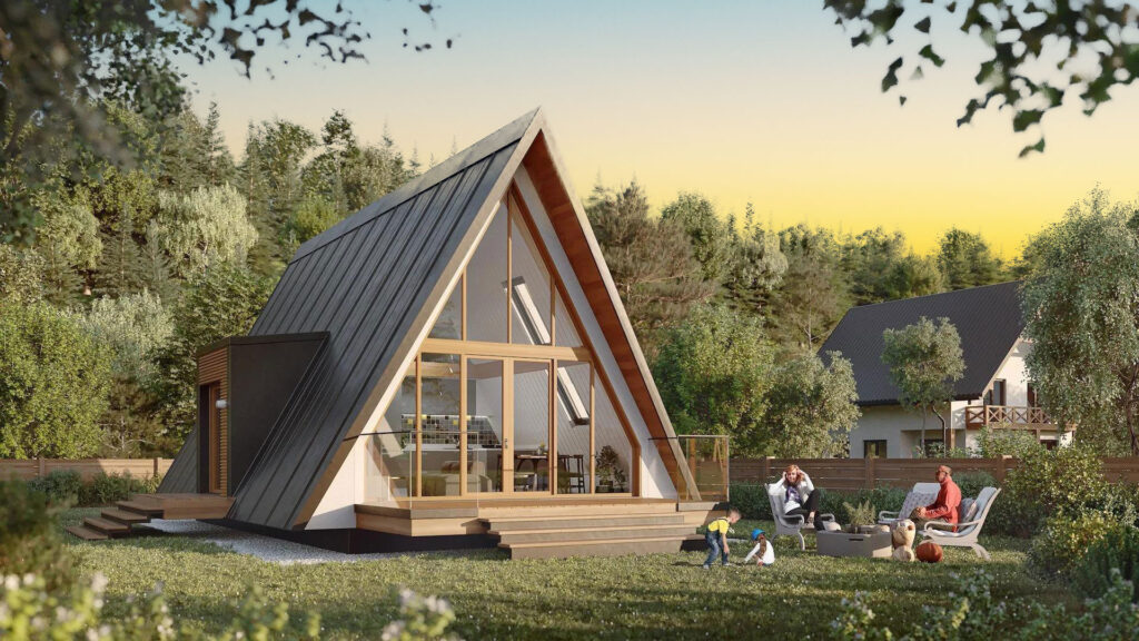 A-Frame View kuća modernog dizajna. Kuća je na dve etaže sa tri spavaće sobe i dva kupatila, ovaj model kuće izdvaja i velika garaža za dva vozila iznad koje se prostire velika terasa na spratu.