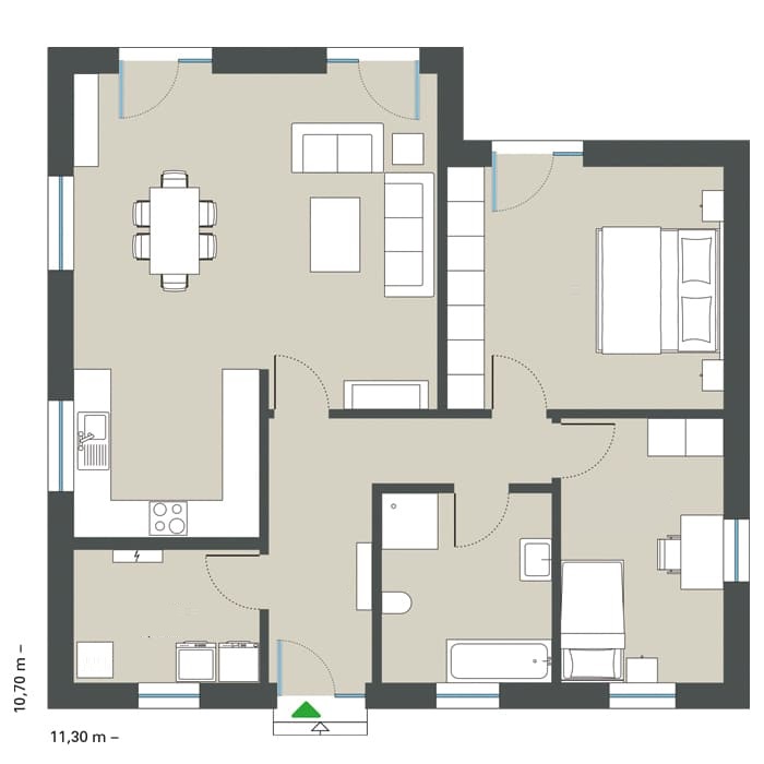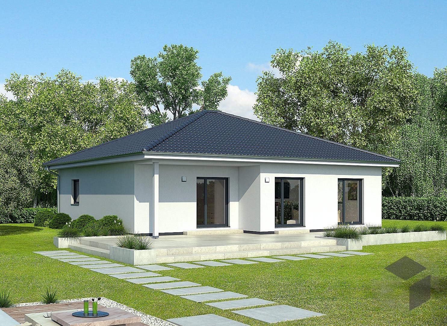 Klasična montažna kuća sa natkrivenom terasom sa strane bašte i svetlim dnevnim boravkom i trpezarijom. Sa kvalitetnim prozorima od poda do plafona. Sa dve spavaće sobe i prostranim dnevnim boravkom. Ukupna površina kuće je 120.91 kvadratnih metara.