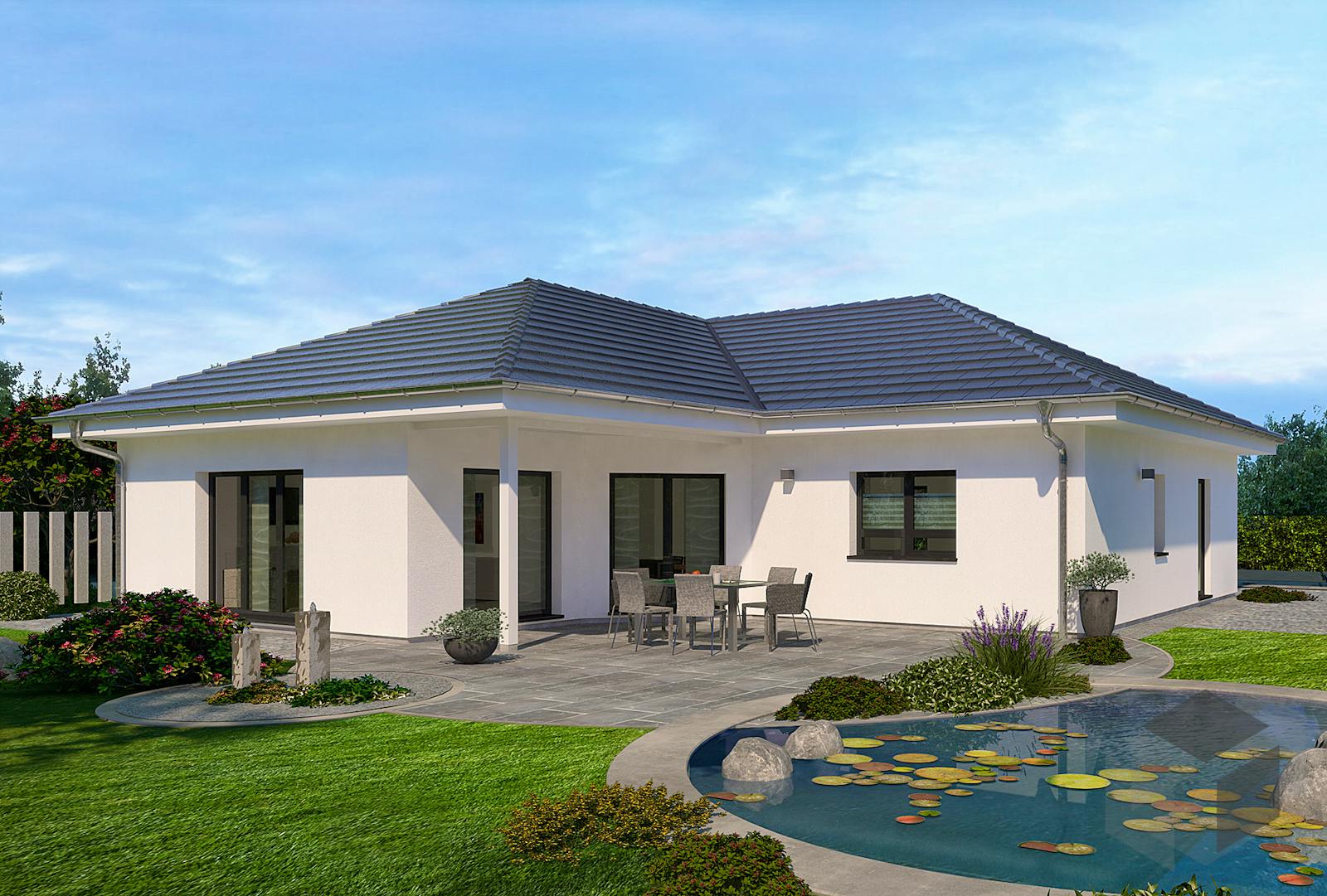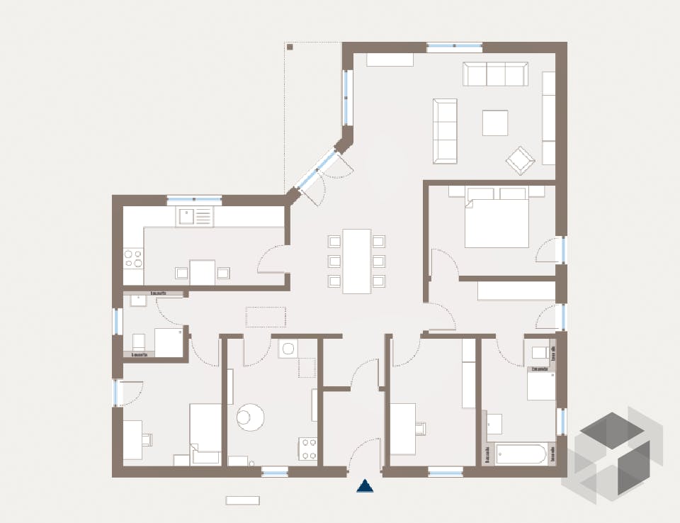 Moderna montažna kuća KM-142 neto površine 142,02 m2 impresionira svojom izdašnom količinom prostora i inteligentnim rasporedom prostorija. Ugaoni bungalov nudi glavnu spavaću sobu sa garderobom koja vodi direktno u kupatilo, dečiju sobu, prostor za radni prostor, toalet za goste i kuhinju – sve na jednom nivou. Pored toga, velika terasa je obostrano zaštićena od vetra. Ova kuća ispunjava sve vaše želje i ne ostavlja ništa da se poželi.