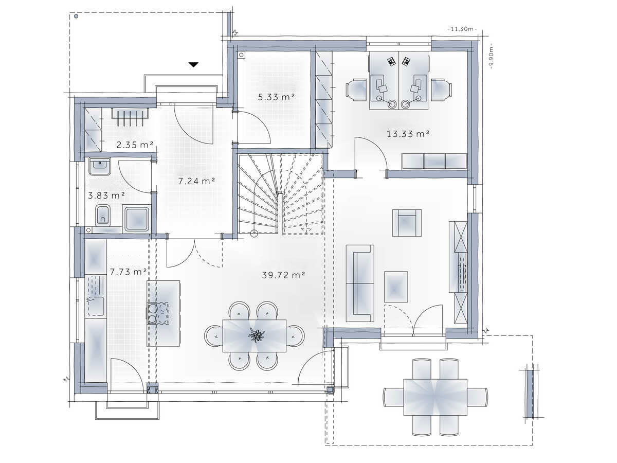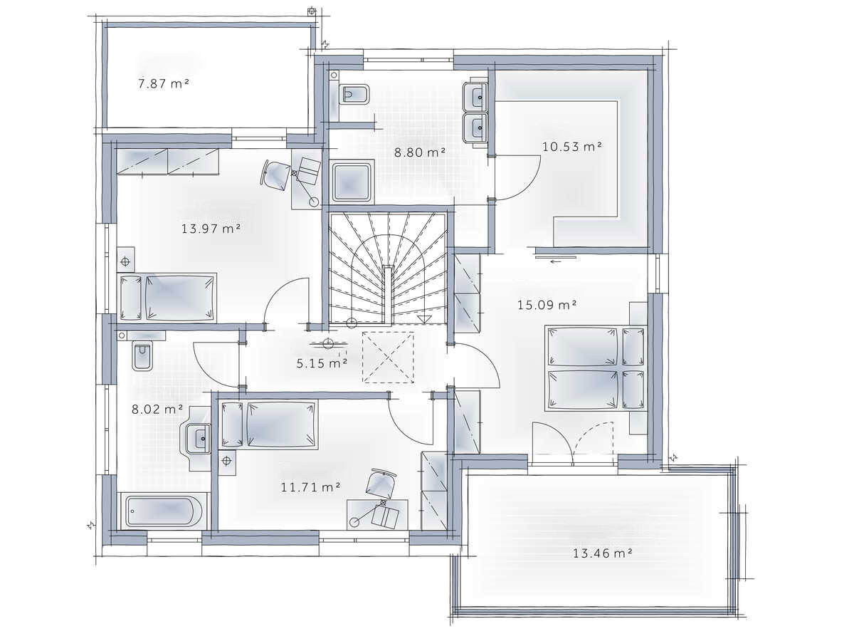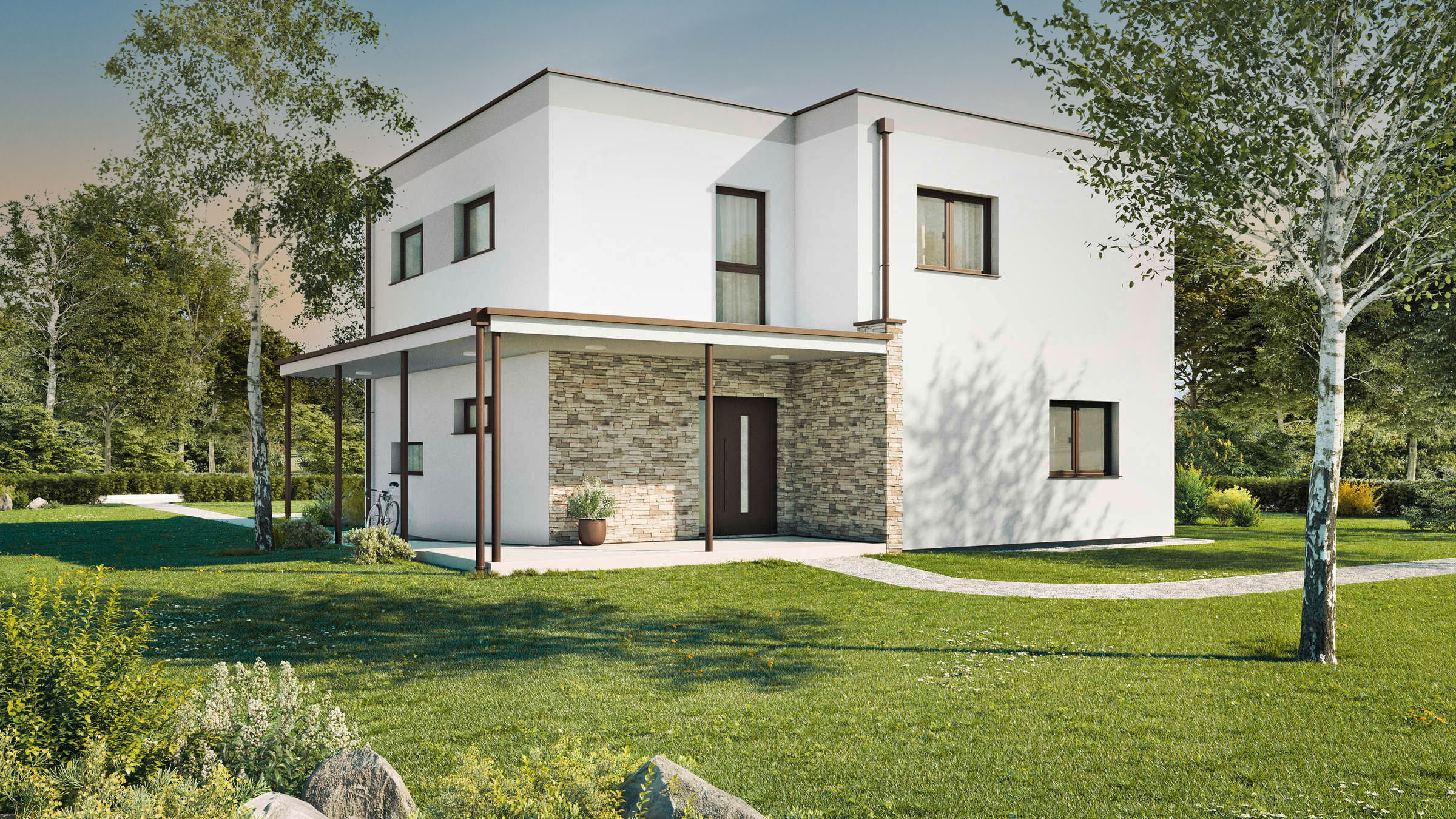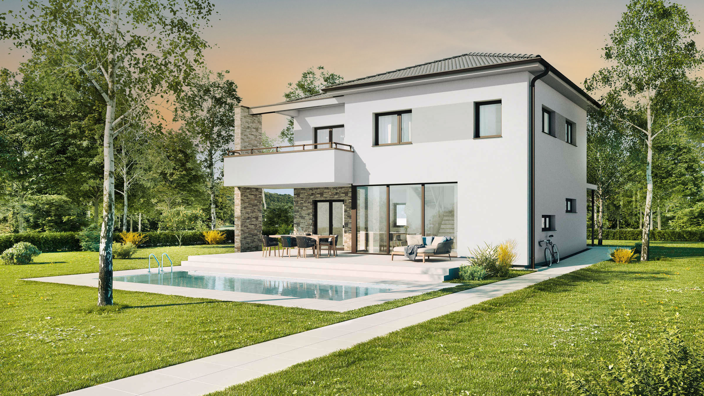 Moderna montažna kuća Penelopa bruto površine 231.70 m2, kao spoj tradicionalne i moderne kuće prilagođena je savremenom načinu života. Predviđena je kao četvorosoban stan sa većim dnevnim boravkom i većom centalnom terasom. Balkonska vrata i veliki svetlosni otvori ostvaruju ugodan i svetao ambijent dnevnih prostorija. Spavaći deo sačinjavaju tri spavaće sobe sa zasebnim kupatilom. Ravni krov jednostavnog oblika daje ovoj kući poseban šarm i eleganciju.